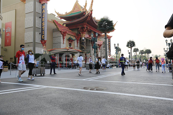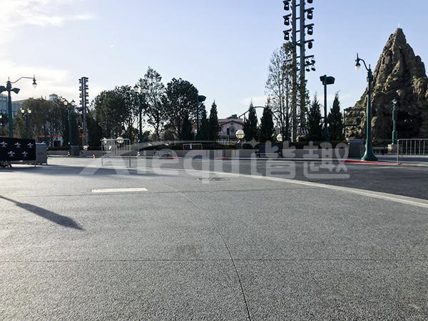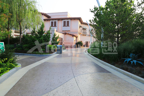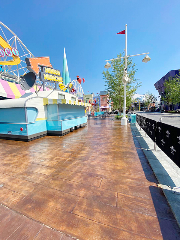 我司參與了北京環(huán)球影城好萊塢大道和小黃人兩個(gè)主題的路面鋪裝工作,鋪裝面積為2.4萬(wàn)㎡。其中包含了彩色混凝土礫石面藝術(shù)地坪、彩色混凝土壓印藝術(shù)地坪、彩色混凝土洗砂面藝術(shù)地坪、彩色混凝土鹽巖面藝術(shù)地坪、彩色混凝土仿泥仿塵藝術(shù)地坪、整體現(xiàn)澆路牙、掃毛面、座椅墻、化學(xué)著色等鋪裝硬景。