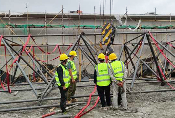 3、華亭煤礦網(wǎng)架工程開工前須組織人員勘察現(xiàn)場(chǎng),復(fù)核軸線尺寸及預(yù)埋件的標(biāo)高、平面位移是否符合設(shè)計(jì)要求。